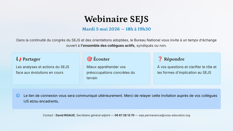 Le SEJS est issu de la fusion en octobre 2005 (déclarée au 1er janvier 2006) de deux syndicats de création ancienne : le SNIJSL, Syndicat National des Inspecteurs de la Jeunesse, des Sports et des Loisirs créé en 1949, et le SNIPJSL Syndicat National des Inspecteurs Principaux de la Jeunesse, des Sports et des Loisirs, créé une vingtaine d’année plus tard. Cette fusion syndicale est consécutive à la fusion de ces deux corps opérée par l'administration par décret n° 2004-697 du 12 juillet 2004.