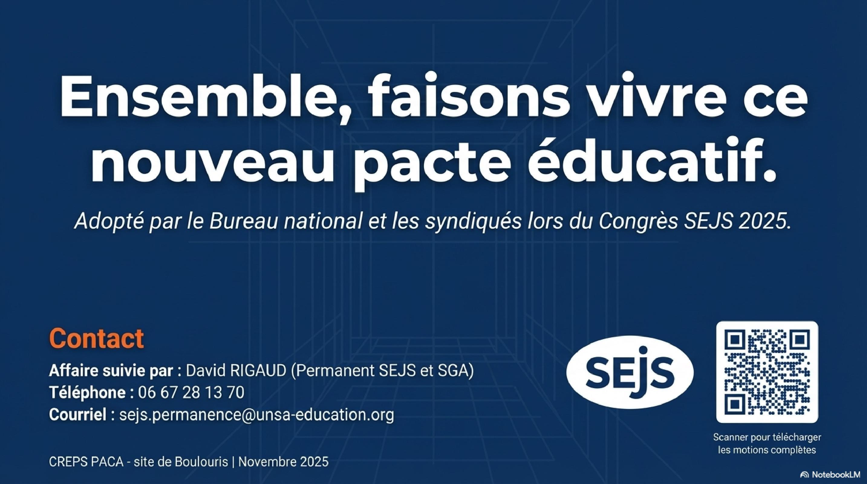 Lors du congrès du SEJS qui s’est tenu au CREPS de Boulouris du 26 au 28 novembre 2025, les congressistes ont engagé un travail approfondi de réflexion sur l’avenir des politiques de Jeunesse et Sports, sur l’organisation de notre ministère, ainsi que sur la reconnaissance de nos missions et de nos métiers.
