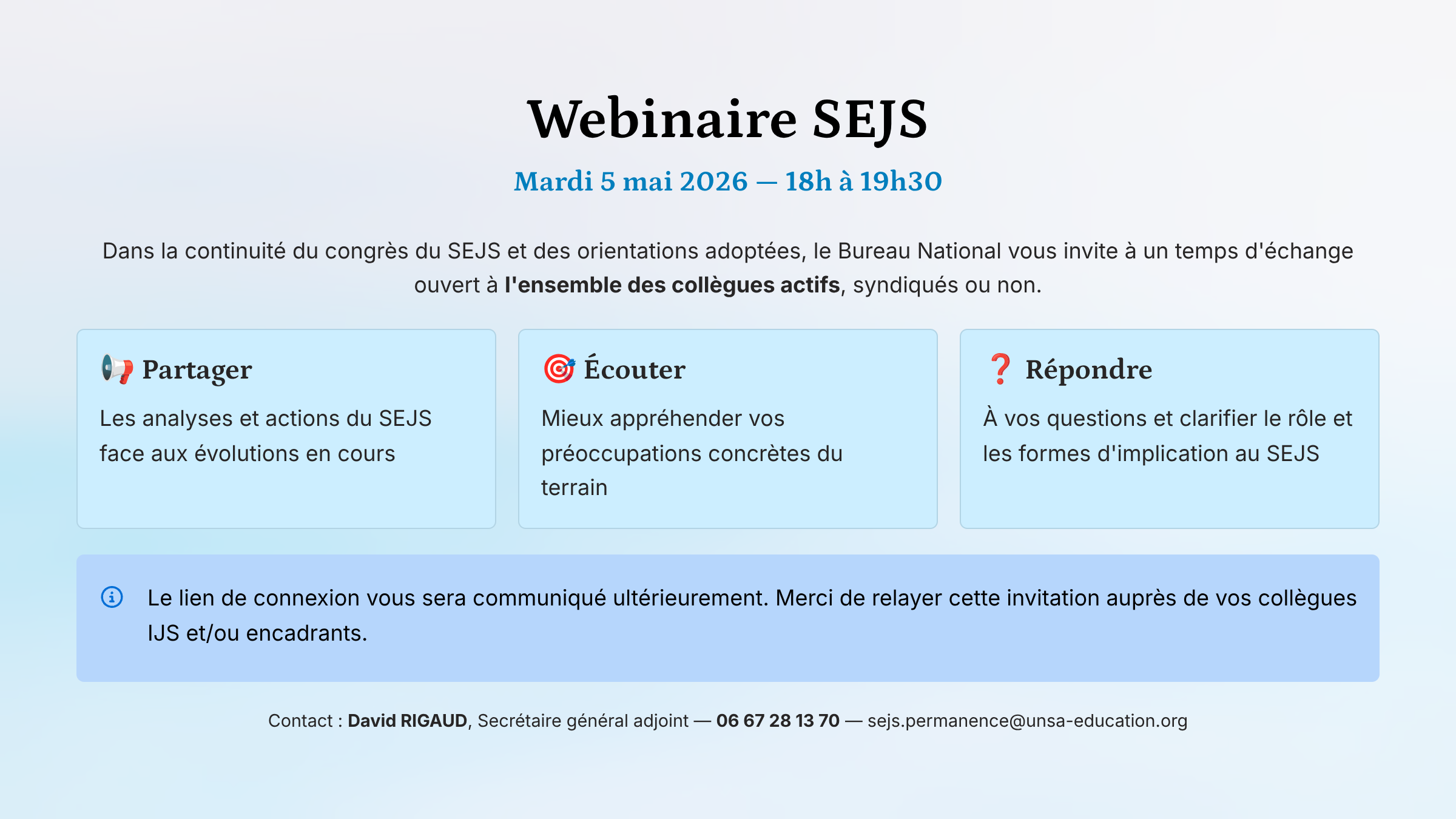 Dans la continuité du congrès du SEJS et des orientations adoptées, le Bureau National vous propose un temps d’échange sous forme de WEBINAIRE ouvert à l’ensemble des collègues actifs (syndiqués ou non) :